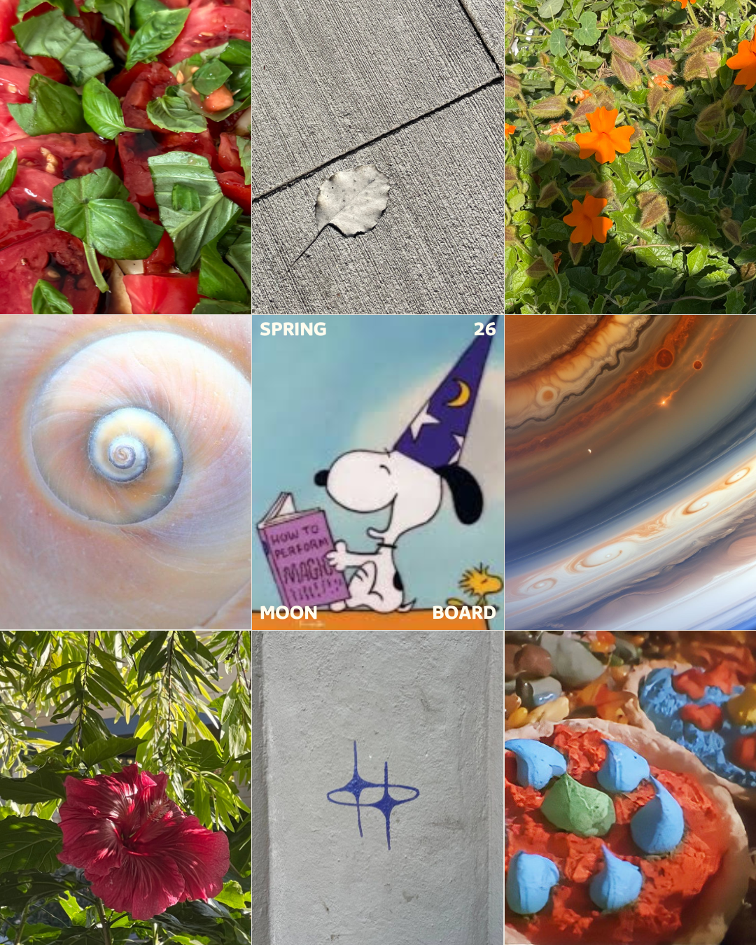 1. my succulent spring equinox caprese 2. leaf “fossil” spotted in the side walk while walking Ginger in Long Beach 3. my selfie shadow among the orange blooms 4. spiral shell holding special meaning as I re-encounter life circumstances that brought me so much grief nearly a decade ago only this time, with a new perspective and acceptance 5. Snoopy gleefully learning magic - a nod to me learning and embracing my own magic in this season 6. a closeup of Jupiter, the planet of optimism, abundance, and growth, currently occupying my sun + rising sign: Cancer 7. giant hibiscus spotted on a neighborhood walk in long beach (nothing for scale, so you just have to trust that this beauty was bigger than my face) 8. twin stars circling each other, a symbol carrying different meanings to me 9. another nod to magic and imagination - one of my favorite scenes from one of my favorite childhood films: Hook. Bangarang!