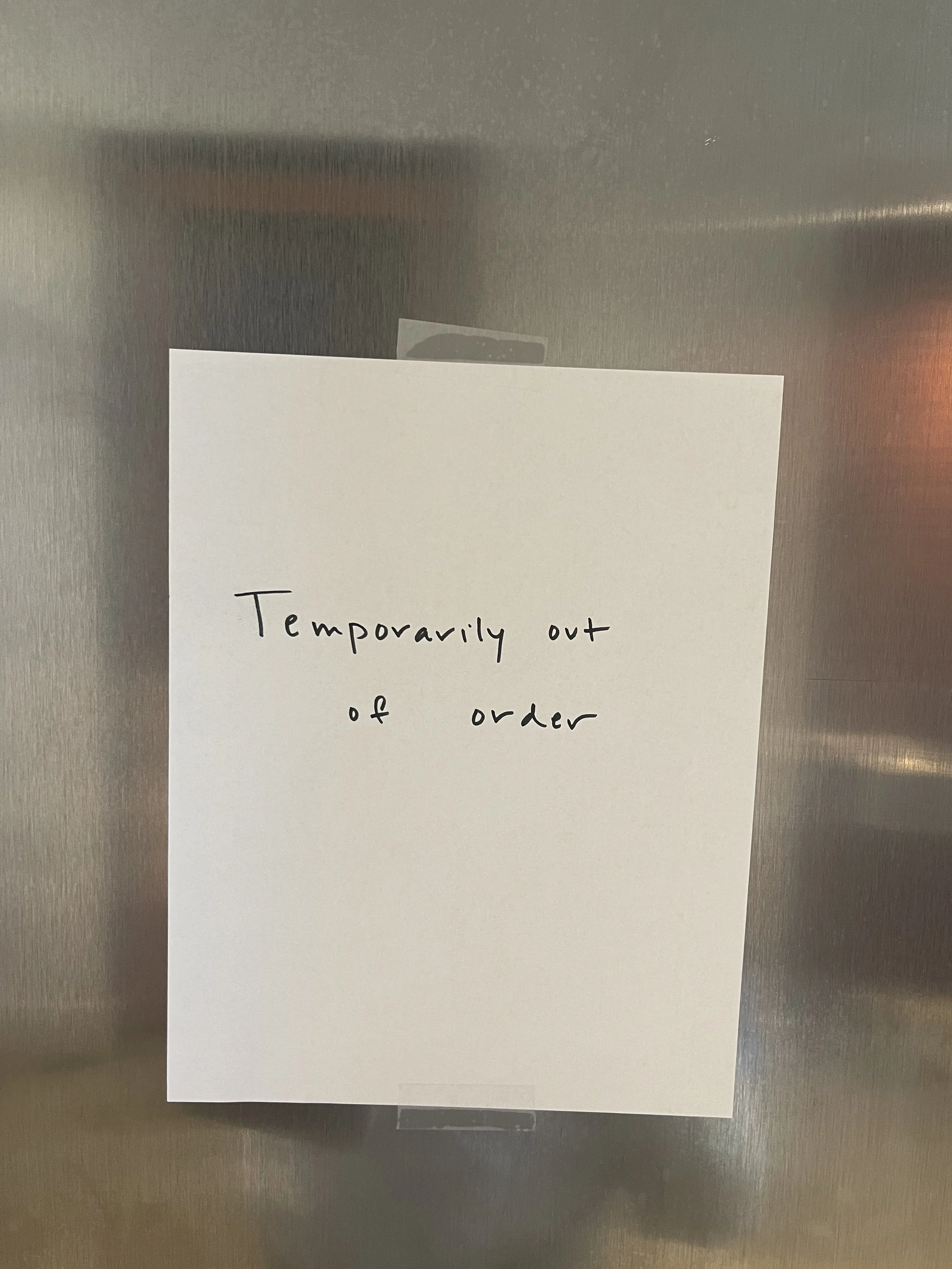 Out of Order sign on elevator that made me pause and wonder what it would be like if we accepted that sometimes we too are out of order and need a break / boundary that folks will honor just as readily.