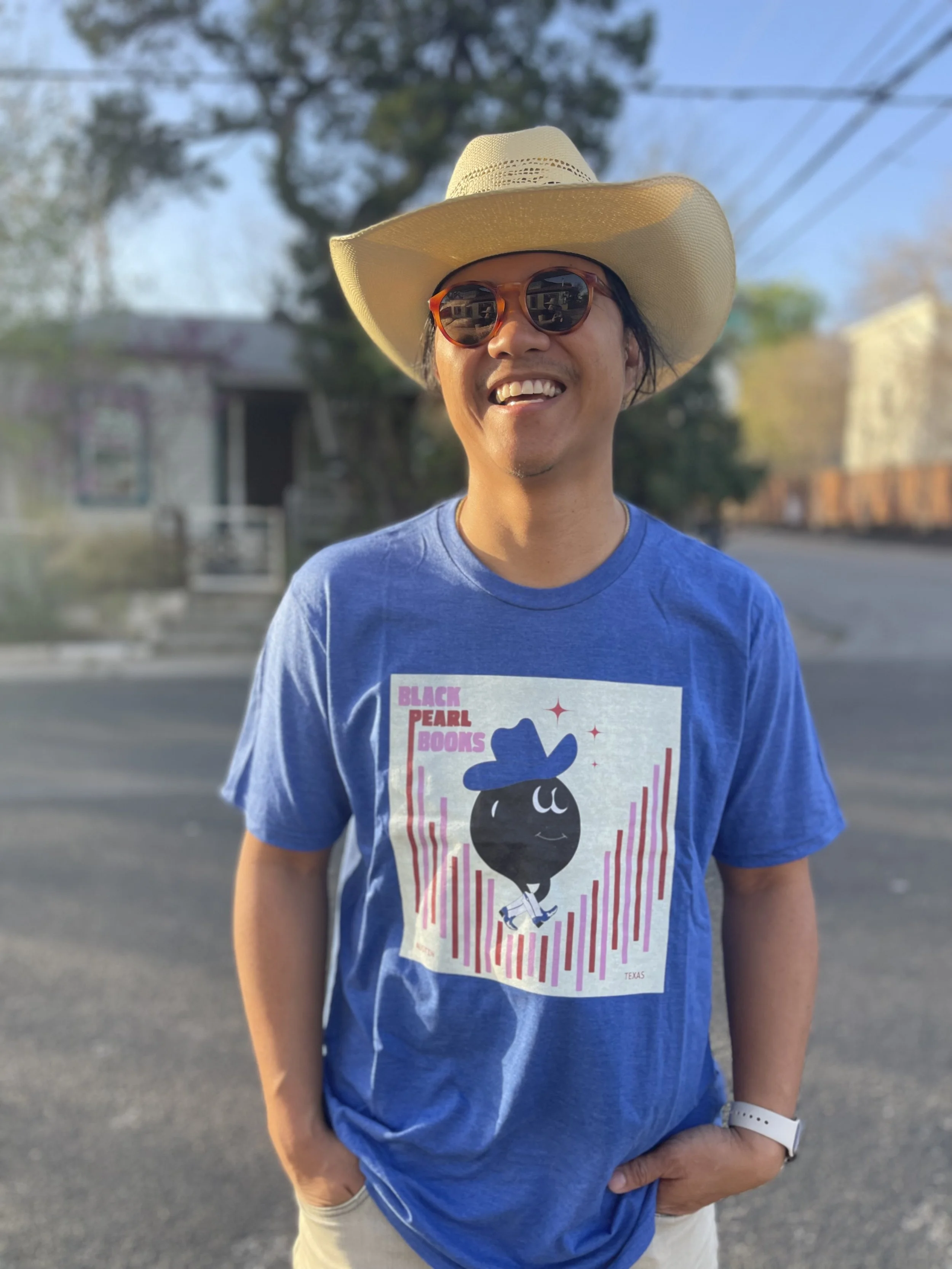 Follow the Moon bumper sticker on a car outside of Barrett's Coffee | My husband during a dog walk in his Black Pearl Books shirt