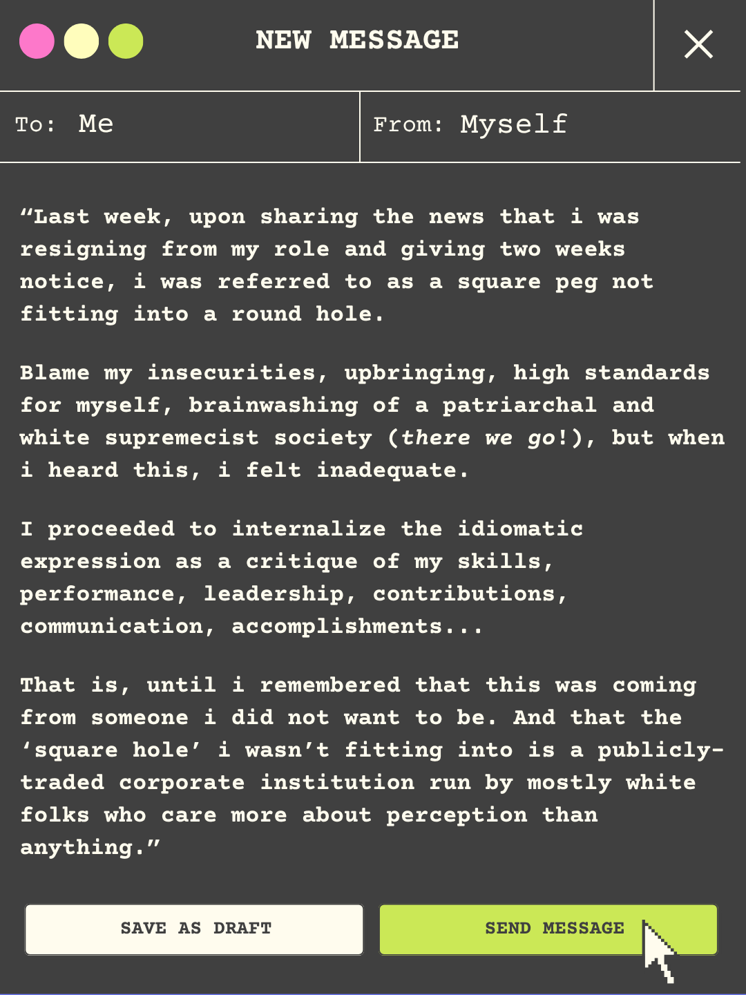 That is, until i remembered that this was coming from someone i did not want to be. And that the ‘square hole’ i wasn’t fitting into is a publicly-traded corporate institution run by mostly white folks who care more about perception than anything.”